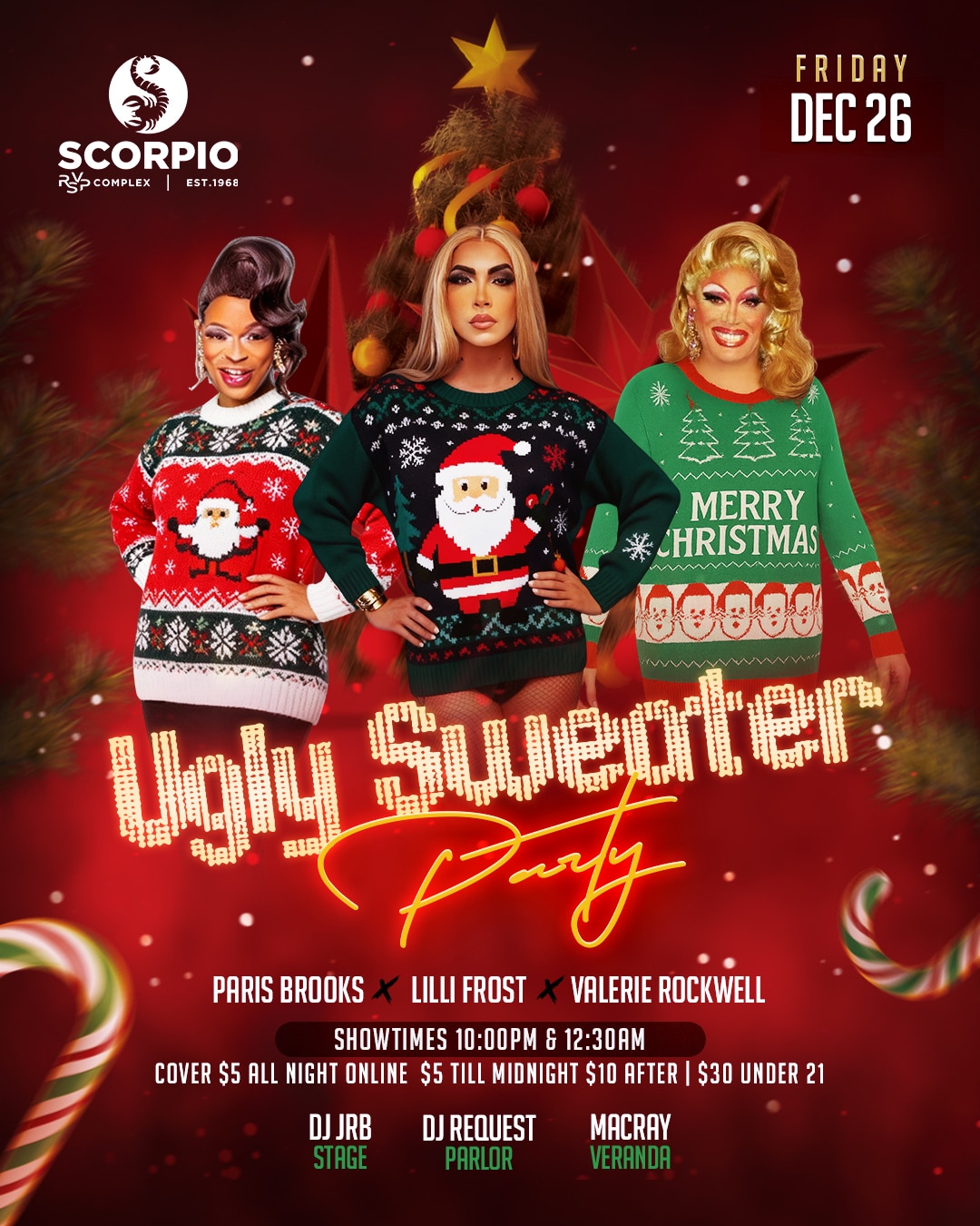 Wear your ugliest sweater and cover is on us! Come slay the season in the most fabulously hideous way possible — lights, music, drag, and pure chaos.