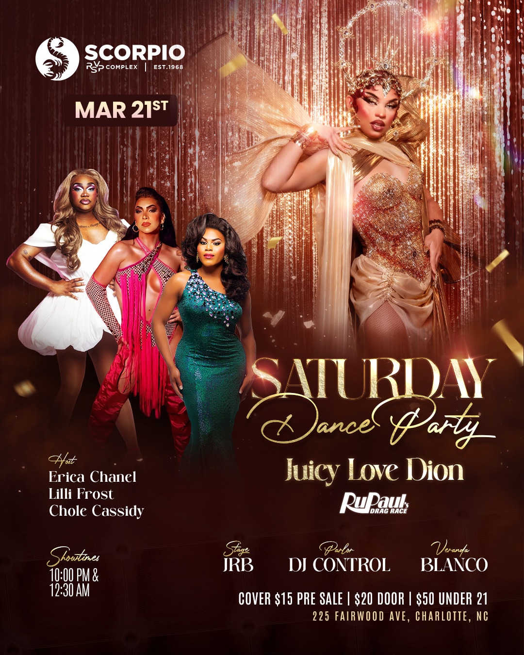 At the re-imagined Scorpio, we’re bringing you top-tier entertainment with dazzling drag shows, featuring some of the most talented queens in the industry. Our lineup includes headliners from prestigious competitions and beloved local favorites. In addition to our fabulous drag shows, we’re excited to host international recording artists who will take the stage and fill the venue with electrifying live music. Our DJ lineup is just as impressive, featuring world-renowned DJs who will keep the energy high and the dance floor packed. Join us for nights filled with music, dance, and pure entertainment!